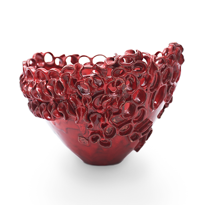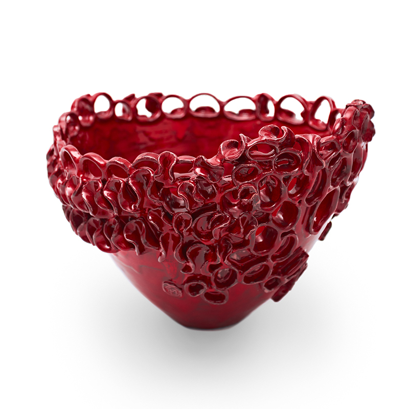 La superficie esterna si distingue per un motivo decorativo formato da cerchi asimmetrici che vanno a coprire gran parte della fascia esterna del centrotavola. La decorazione fatta con lo smalto rosso rubino vuole trasmettere passione e forza.