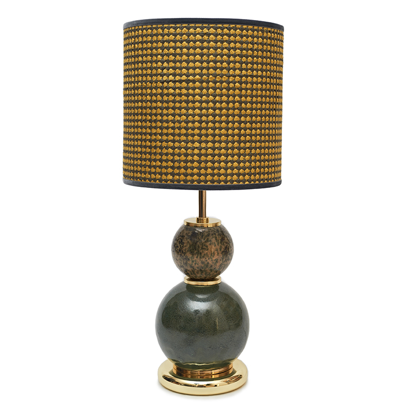 Il paralume è realizzato con un prestigioso tessuto dell’azienda Designers Guild e la base è in acciaio cromato dorato.