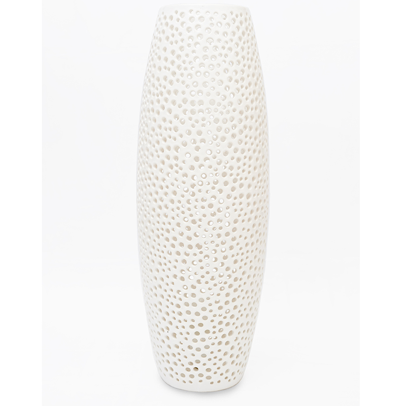 La lavorazione dell’argilla per realizzare la lampada NUR, è stata eseguita a mano, la creatività, l’ingegno e l’ abilità tecniche dell’ artista LIUVA MAQUEIRA gli permette di creare manualmente qualsiasi forma. La superficie esterna della lampada si distingue per un motivo decorativo formato da cerchi asimmetrici traforati a coprire integralmente tutta la fascia esterna della lampada.