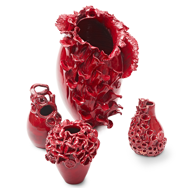 L’artista coniuga insieme elementi lavorati a mano con il tornio e rifiniti con la tecnica del colombino, processo molto intuitivo che rende l’oggetto armonioso nelle sue forme, creando delle sculture uniche che le rendendole originali.